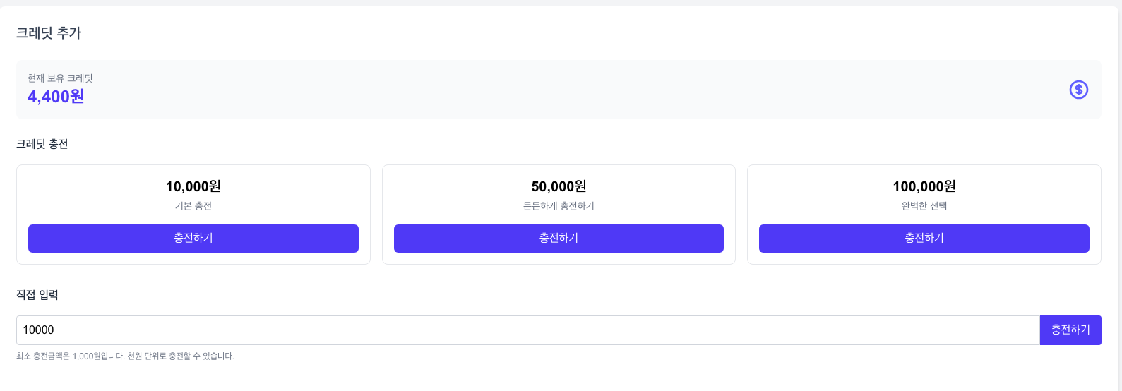 이 페이지에서는 다양한 금액의 크레딧 충전 옵션과 충전 방법을 선택할 수 있습니다.